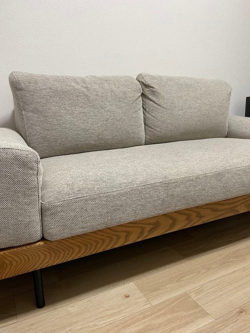 引越しのため不用にやりましたので売ります。ニトリの商品で、新型になります。半年使用しました。除湿シート+カバーとクッションにもカバーをかけて大切に使ってたので直接肌は触れておらずシミもなくキレイだとは思います。(個人の意見のため神経質な方はご遠慮下さい。)キズは見た感じないです。引越しのため売ります。USBポート部分は使用してません。サイドの収納棚があることで、ソファを立てかけるとカウチのように足が伸ばせます。- 色: グレー- 素材: ファブリック- 構造: 木製フレーム- クッション: 取り外し可能- クッション数: 4つのクッションサイドラック付きは左右どちらでも取り付け変更可能ペットなし禁煙者