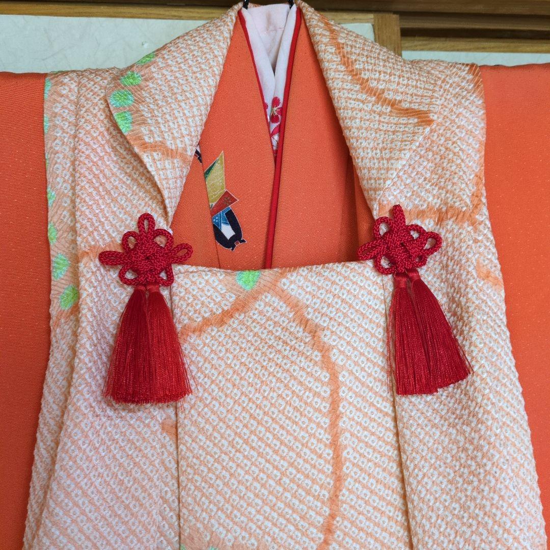 *こちらの商品は、着物&袋帯のみです。\r淡い薄ピンクや朱色のグラデーション地に、金や銀駒刺繍の花文が施された総絞りの素敵な7歳七五三のお着物と袋帯のセットです(長襦袢はおまけでお付けしますが、その他のはヘッドピースはセットに含まれません)。比翼付き\r\r袴と合わせてハーフ成人式や小学校の卒業式にもご利用いただけます。また、お子様の体型にも寄りますが十三参りまでご着用可能となります。\r\rお小物類(帯揚げ、帯締め、しごき)は別途3000円、また追加で筥迫と末広は+3000円頂戴します。*お小物類のセレクトはおまかせとまります。\r\r(着物)身幅大きめのふくよかサイズ。内揚げが5㎝ございます。左共衿、左内袖、右外袖矢印部分にシミがございますが遠目から見たらあまり目立ちません。衿の小シミは付け衿をして頂くと隠れます。胴裏にアクがございますが着用時見えません\r(長襦袢)袖丈の合うものをおまけでおつけいたしますが、中古品のためシミ汚れがある場合がございます(素材はお選びいただけません)。\r(帯)写真の様に、垂れ先側の矢印部分にシミがございますが遠目から見たらあまり目立ちません。\r\r【表地素材】(着物)正絹、(帯)正絹\r【色】淡い薄ピンク、朱色\r【サイズ】(着物) 裄:50cm、肩上げ:3.5cm、袖幅:30.5cm、袖丈:75cm、丈(肩から):139cm、腰上げ:0cm、前幅:21cm、後幅:27cm\r(帯) 幅:25.2cm、長さ:386cm\r\rお求め安い価格での出品ですので、いかがでしょうか?\r\r即決購入歓迎します。\r複数購入の場合は、お値引きいたしますのでコメントください。\rご不明な点は、ご購入前にお気軽にご質問ください。\r1日経ってもコメントへの返信がない場合は、見落としの可能性がございます。お手数ですが、再度ご質問いただければ幸いです。\r\r7歳女の子はこちら #ag子供7歳\r女の子はこちら #ag子供\rハーフ成人式はこちら #aハーフ成人式\r7歳女の子ふくよかはこちら #ag子供7歳ふくよか\r総絞りはこちら #a総絞り\r\rn\"